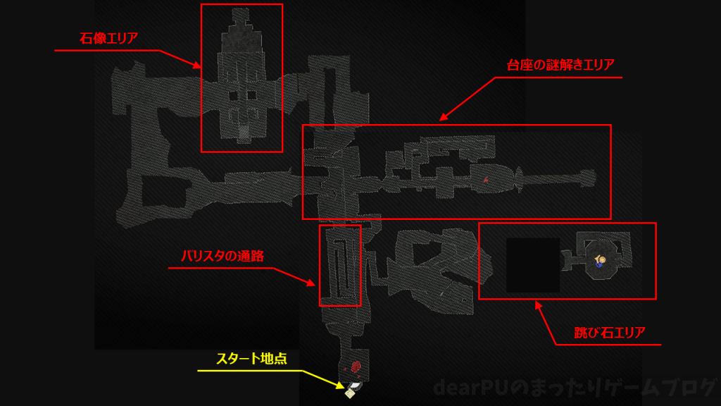 そこで、「哀悼」の台座の謎解き(回転パズル)やギロチンエリア・跳び石エリアの攻略と入手できるアイテムについて画像と詳細マップ付きでご紹介します。