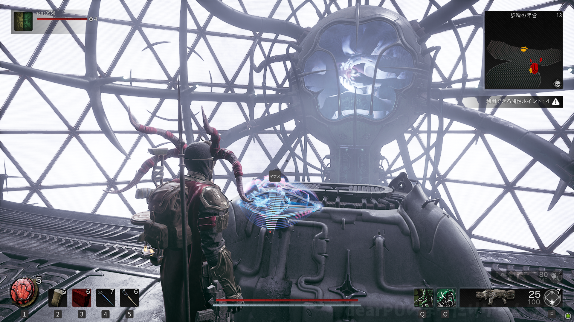 エリア「歩哨の陣営」の最上階のチェックポイントで休んだ後、奥のエリアの装置(左側)を調べます。